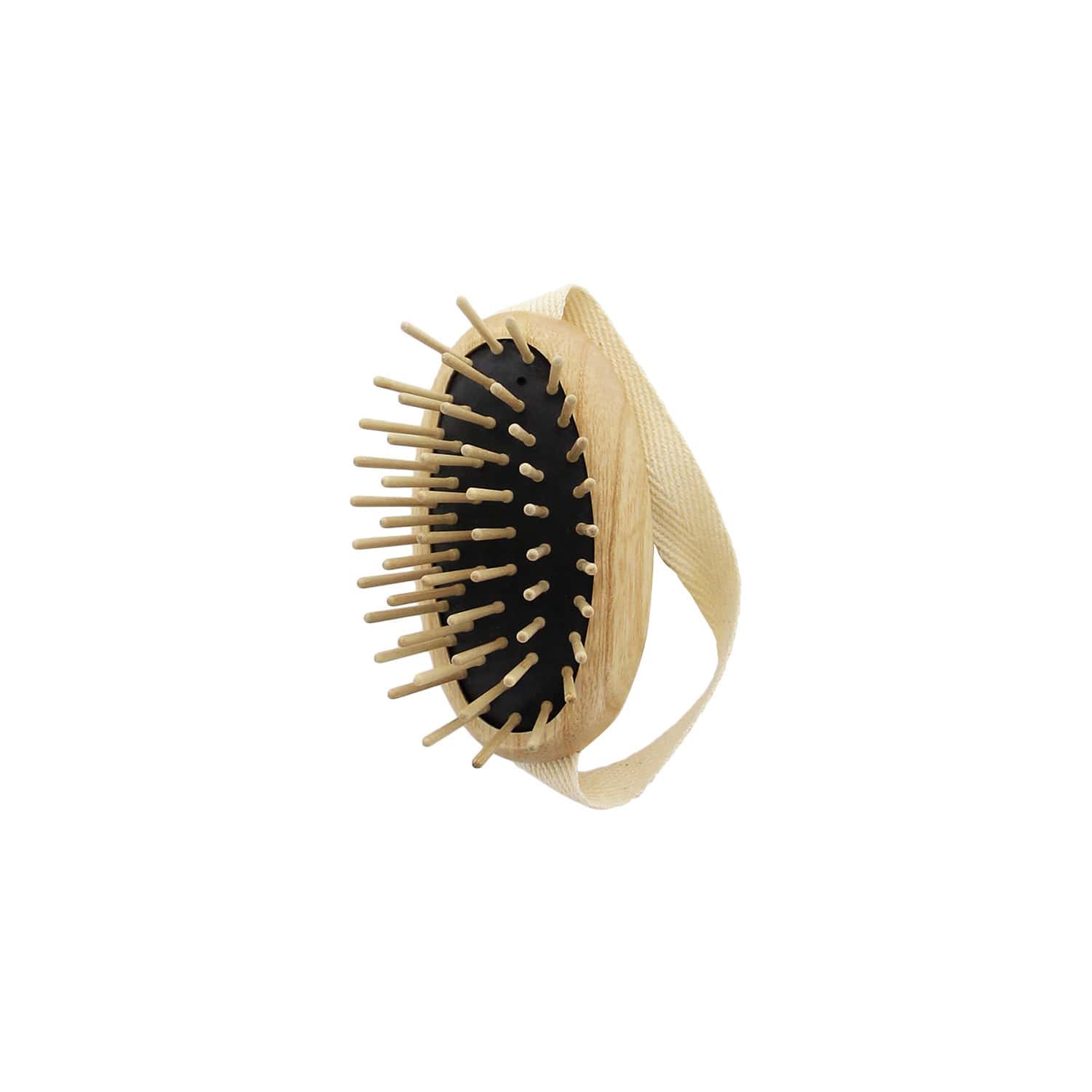 Cepillo Tek para masaje capilar con púas en madera natural y soporte en caucho natural. Banda de agarre en algodón.