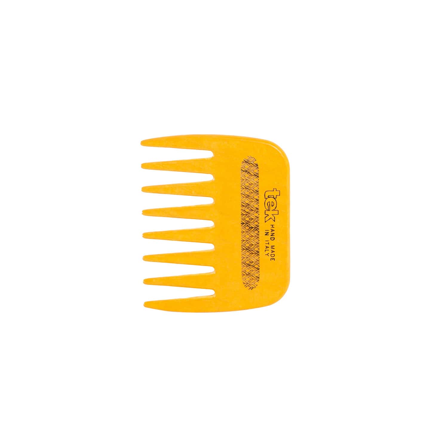 Peine Tek afro naranja de madera natural con púa ancha, ideal para cabello ondulado y rizado.