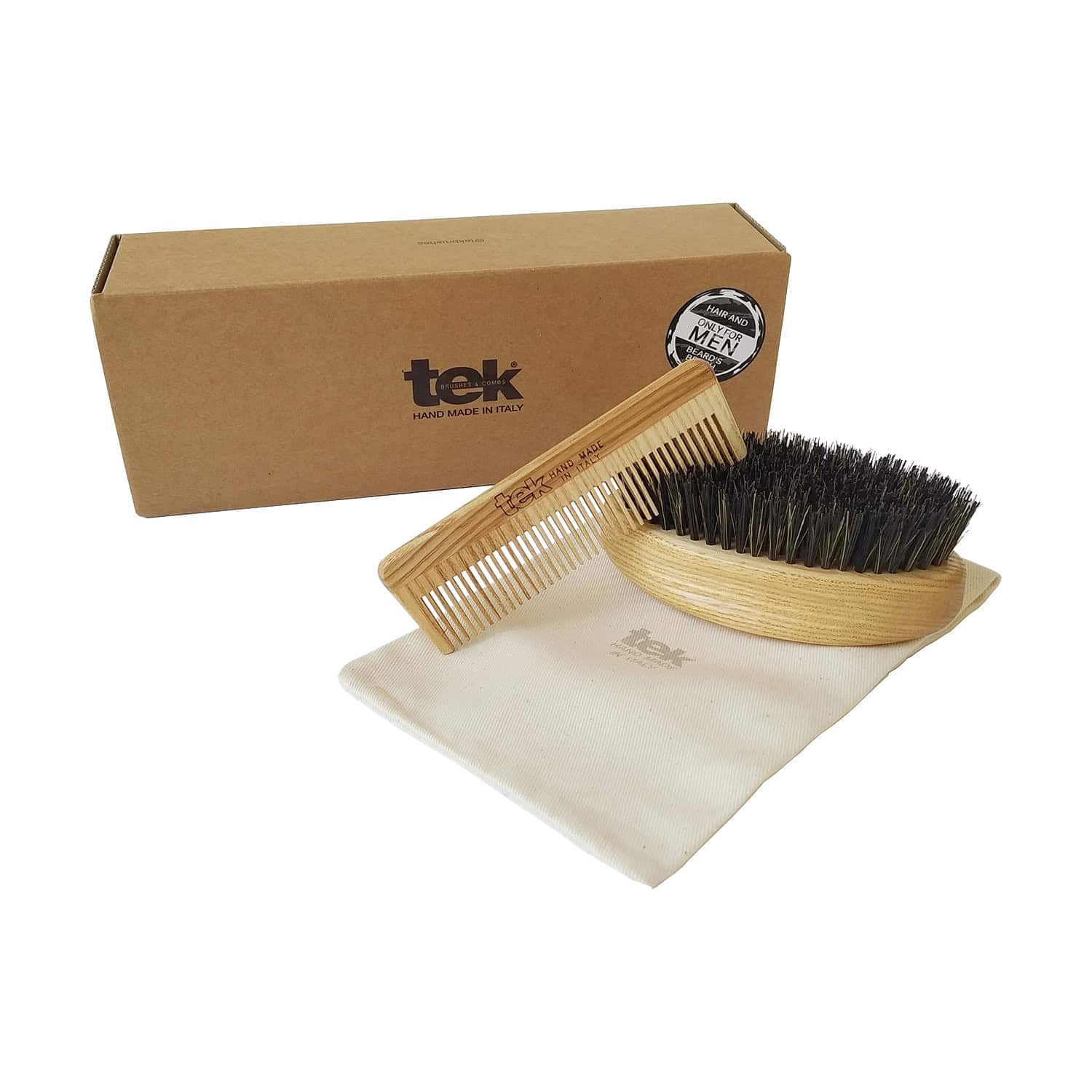 Set para el cuidado de la barba compuesto de cepillo y peine con bolsa de algodón.